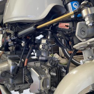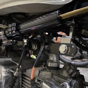 苦労したのは、ダンパーのシャフトがステアリング左右に振った際、大きく左右、前後に移動することから他の場所との干渉を避けるダンパーと、ステアリングブラケットの取り付け位置調整に2~3時間かかりました。足とぶつかった時には、こりゃダメだと一旦諦めましたが、根気よく場所探し。