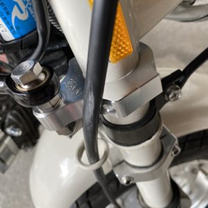 タイヤは10インチにしましたが、ステアリングは標準のままのため、参考になるサイトを探しましたが、詳しい内容まで確認できず、皆さん、苦労されている様子は想像できました。参考になったのは、ミニ〇ト製の「Z50Jモンキー専用ステアリングダンパーキットシルバーNO1413」