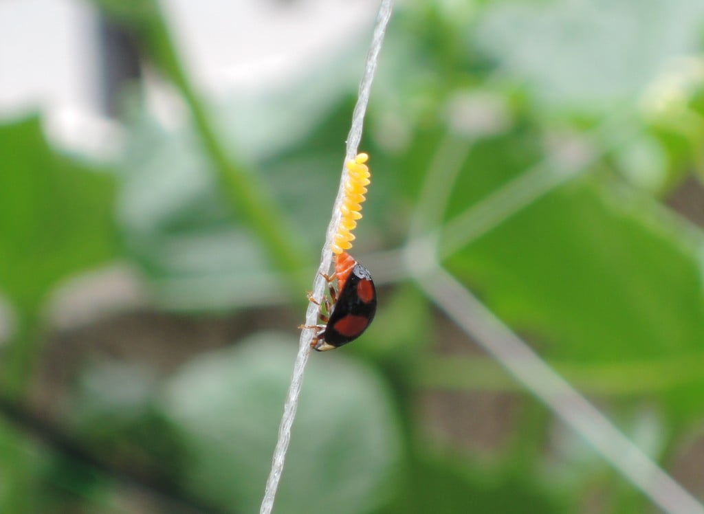 家庭菜園でキュウリの網にテントウムシが産卵していました。