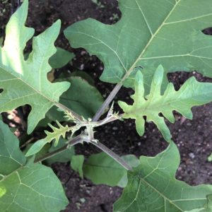 家庭菜園のナスですが、よく見ると別の葉っぱが生えています。