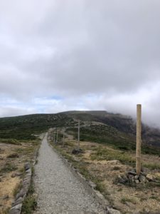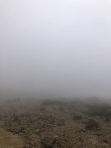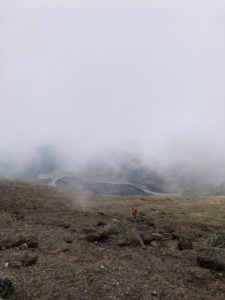スタートはハイラインまでゴリラで登って、そこから。気温は11℃ほど。風強いし、ときおり雲で山頂が見えません。