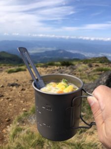 お決まりのランチタイム。かなり風が強く、熱かったカップヌードルは直ぐ冷めました。では下山します。