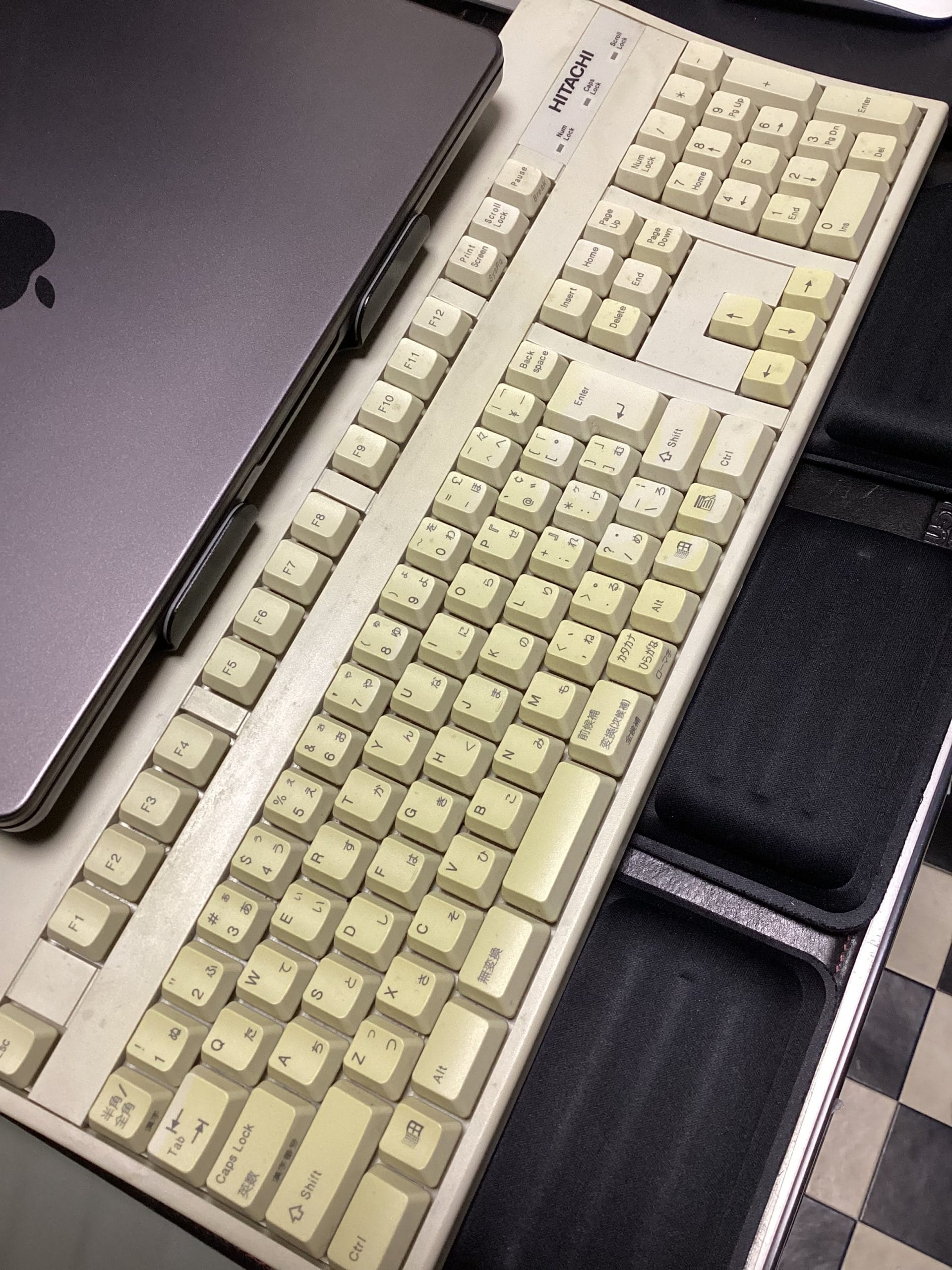 PCスタンドを設置して、倉庫の奥を漁ってみる。あったあった。昔使っていた30年前のキーボードを引っ張り出してきました。