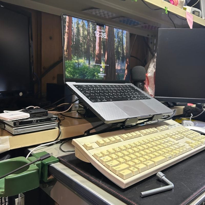 マルチ画面環境では、MacBook内蔵キーボードはどうしても入力しづらい。向きを変えられて、自由に動かせるキーボードはやはり必須だと、改めて感じました。