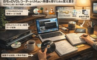 しゅみのPCいじり 「おやじのため息」アーカイブ Vol.5_ブログ前夜、2008年7月26日(土)の記録 自宅のDVDレコーダーからMacへ映像を移すための覚え書き。当時はいろいろ試行錯誤していた。CPRM対応のDVDは、そのままでは扱いづらく、専用ツールを使って処理する必要があった。ネットで情報を探しながら、コマンドラインでキーを取得し、デー... 2026.04.14 しゅみのPCいじり