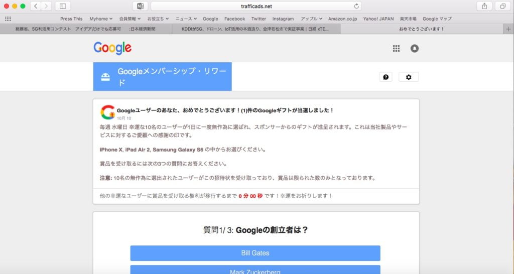 注意喚起!フィッシング詐欺にご注意! しゅみのPCいじり X Facebook0 はてブ0 LINE コピー 2018.10.10 グーグル検索していたら突然、「Googleユーザーのあなた、おめでとうございます!」の画面。明らかに怪しい!! 質問も、ユーザー評価も良く作られていて、簡単のため思わず質問に答えたくなります。でもだまされません。SSL対応のページでなく、プレゼント商品がiPhoneXはあり得ない。! ネット情報では、かなり以前から出没しているようで、URLを変えながらはびこっているようです。Googleにも報告はしました。 ネットユーザーの皆さん、お気を付け下さい。
